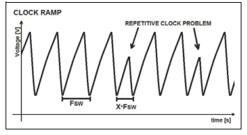 如果石英振蕩器有噪聲感應電壓在上升坡道上的尖峰,門檻將被越過早些時候,時鐘信號會比它早應該,如圖所示,這也將提前開始低坡道在圖中,這導致切換的突然變化PWM信號的頻率和高抖動,該時鐘斜坡非常容易受到PCB布局的影響芯片周圍的元件,因此,除非開關(guān)頻率在內(nèi)部產(chǎn)生,易受影響蝕刻和元件會引入噪聲額外的抖動,這種行為可以避免,或者至少可以避免通過遵循適當?shù)腟MPS布局規(guī)則最小化.