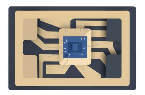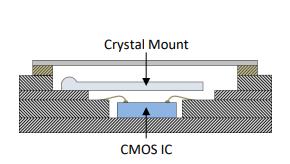 使用硅MEMS技術(shù)可以在同一芯片上制造定時(shí)陶瓷諧振器和溫度傳感器。使用傳統(tǒng)的石英晶體組裝工藝不可能同時(shí)振制造諧振器和溫度傳感器。石英TCXO的封裝,材料和性能限制需要晶體和溫度傳感器之間的大位移。石英傳感器需要對(duì)石英坯料進(jìn)行細(xì)致的加工,拋光和修整,以在整個(gè)溫度范圍內(nèi)實(shí)現(xiàn)所需的頻率穩(wěn)定性,而CMOS IC上的振蕩器電路,溫度傳感器和補(bǔ)償電路使用傳統(tǒng)的硅微加工技術(shù)制造。將這兩個(gè)基于兩種不同材料系統(tǒng)的組件集成在一起會(huì)帶來許多挑戰(zhàn)。石英換能器通常使用導(dǎo)電粘合劑安裝在陶瓷封裝中,使得其用環(huán)境氮?dú)鈶腋≡诜庋b腔中。晶體通過鎢通孔和金線鍵合電連接到CMOS IC,CMOS IC安裝在封裝的底部。圖3a顯示了一體化石英晶體振蕩器陶瓷封裝的橫截面示意圖3b頂蓋上安裝有石英晶體的去蓋部分和3c與石英晶體相同的部分移除后,顯示CMOS IC,溫度傳感器,振蕩器和補(bǔ)償電路安裝在封裝底座上的晶體下方。