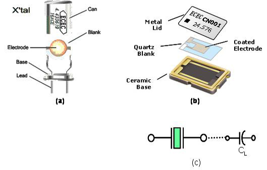圖中(a)及(b)分別是DIP型式及SMD型式的石英振蕩子的基本結(jié)構(gòu)圖. 圖中(c)是電子電路上所使用代表石英振蕩子的電子符號. 當(dāng)石英晶體共振子處在遠(yuǎn)離振蕩頻率區(qū)域時, 石英晶體共振子僅是一個電容性的組件, 當(dāng)頻率接近石英晶體的振蕩頻率時, 就接近是一個電感性的等效LCR振蕩線路.