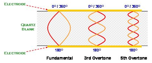 在AT切割角度的石英晶體共振子主要是以厚度剪切振蕩模態(tài)存在. 石英晶體在共振時(shí), 除了基本波振蕩之外, 高階的倍頻共振也與基本波振蕩同時(shí)存在于石英晶體的電極區(qū)域之間. 但是, 由于壓電材料的電極是電氣相位相反的振動(dòng)環(huán)境, 所以, 祇有奇數(shù)倍(odd number)的高頻倍頻可以發(fā)生, 偶數(shù)倍(even number)的倍頻共振在石英晶體共振子是不會(huì)存在的(圖十).