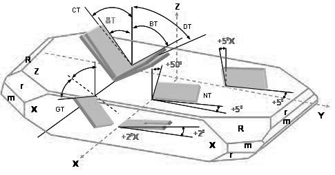 依據(jù)不同的應(yīng)用領(lǐng)域及工作溫度需求, 因應(yīng)了許多不同的石英切割角度種類(lèi). 例如AT-, BT-, CT-, DT-, NT, GT…..等不同的切割板片. 不同的切割方向的板片具有不同的彈性常數(shù)張量(elastic constant tensor), 不同的壓電常數(shù)張量(piezoelectric constant tensor)及不同的介電常數(shù)張量(dielectric constant tensor). 這些張量在石英組件的設(shè)計(jì)及應(yīng)用上展現(xiàn)了不同的振蕩及溫度特性. (圖三)表現(xiàn)了在Z-plat石英結(jié)構(gòu)上,幾種不同方向的石英板片切割方式..jpg)