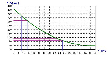 在圖中, CL=24 pF 時的頻率敏感度是10 ppm/pF, 及CL=10 pF時的頻率敏感度是20 ppm/pF. 在并聯(lián)線路中, 負載電容越小, 頻率對負載電容變化的敏感度越高. 相反的, 負載電容越大, 頻率對負載電容變化的敏感度越低. 這就是石英晶體共振子用于VCXO線路上時, 線路設計上會選用較小負載電容. 反之, 在要求較準確的頻率信號時, 線路設計上會選用較高的負載電容.