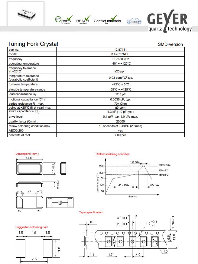 | 12.87181 | GEYER | CRYSTAL 32.7680KHZ 12.5PF SMD | KX-327NHF | ±20ppm | -40°C ~ 125°C | 2 | 3215 |