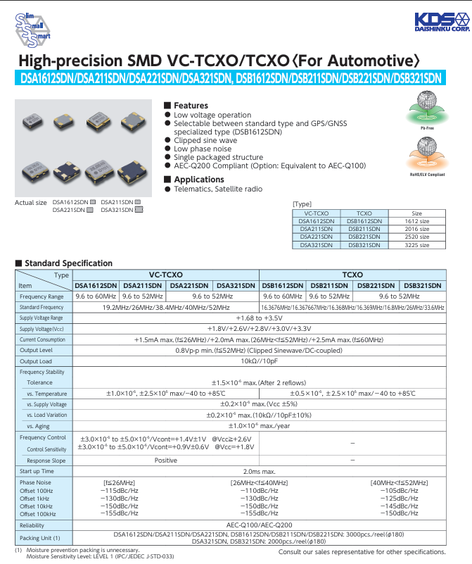 這款VC-TCXO有源晶振的核心優(yōu)勢(shì),在于其對(duì)極端環(huán)境的超強(qiáng)適應(yīng)力.作為符合AEC-Q200標(biāo)準(zhǔn)的車(chē)規(guī)產(chǎn)品,它能在-40℃至+85℃的寬溫區(qū)間內(nèi)穩(wěn)定運(yùn)行,頻率偏差控制在±1.0×10??以?xún)?nèi).這種嚴(yán)苛環(huán)境下的穩(wěn)定性,恰是車(chē)載系統(tǒng)的生命線——進(jìn)口晶振無(wú)論是遠(yuǎn)程信息處理傳輸數(shù)據(jù),還是衛(wèi)星廣播接收信號(hào),微小的頻率偏差都可能導(dǎo)致通信中斷.而其低相位噪聲特性,更讓信號(hào)傳輸如“靜水行舟”,在10kΩ//10pF的負(fù)載條件下,相位噪聲指標(biāo)可達(dá)-155dBc/Hz,為車(chē)載通信筑起抗干擾的“防護(hù)盾”.KDS溫補(bǔ)晶振,大真空有源晶振石英晶振