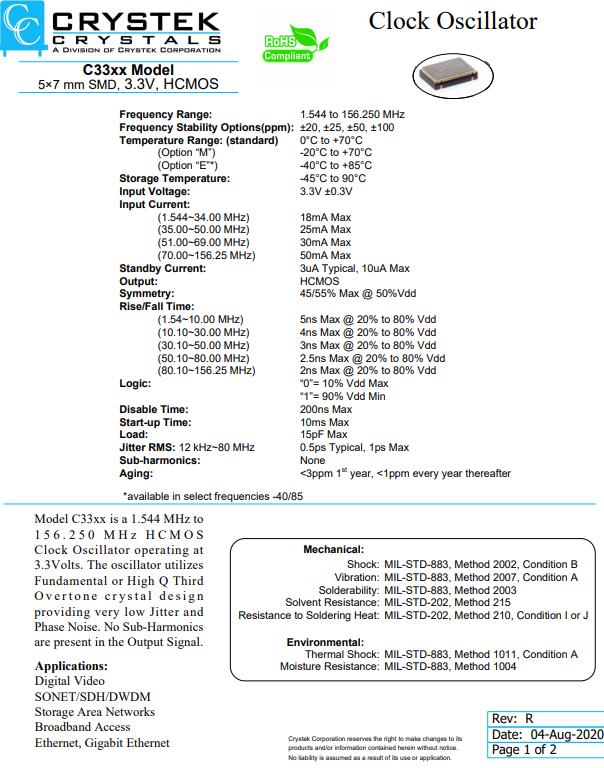 | C3392-32.768 | Crystek晶振 | C33 | XO (Standard) | 32.768MHz | ±50ppm |