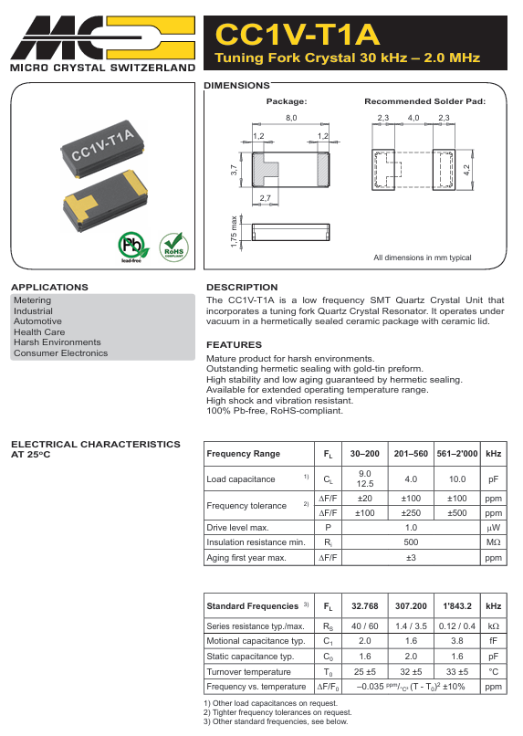 | CC1V-T1A-307.20kHz-4pF-100PPM-TA-QC | Micro Crystal | 晶體 307.200 kHz 4.0 pF +/-100 PPM -40/+85C | - 40 C | + 85 C |