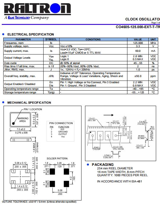 | CO46 系列 125 MHz 7 x 5 mm 3.3 V ±50 ppm 表面貼裝 時鐘振蕩器 | |||||||