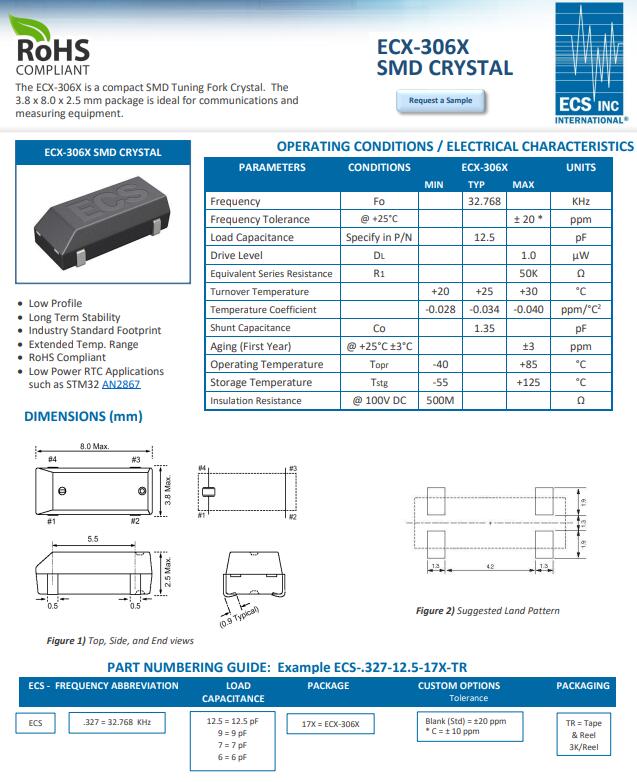 | ECS-.327-12.5-34RR-TR | CRYSTAL 32.768KHZ 12.5PF SMD | ECX-34RR | kHz Crystal (Tuning Fork) | 32.768kHz | - | - | Surface Mount | 2-SMD, No Lead | 0.126" L x 0.059" W (3.20mm x 1.50mm) |