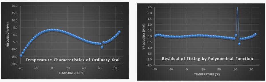 圖4顯示了使用普通石英坯料的TCXO的溫度特性,在63°C時(shí)具有意外的頻率擾動(dòng).因此,如果工作溫度接近此臨界溫度點(diǎn),則輸出頻率將發(fā)生突然跳躍.由這種不準(zhǔn)確頻率驅(qū)動(dòng)的系統(tǒng)至少會(huì)暫時(shí)出現(xiàn)惡化甚至故障.因此,Jauch溫補(bǔ)晶振只使用高質(zhì)量的石英坯料和復(fù)雜的晶體設(shè)計(jì),以避免我們的TCXO出現(xiàn)任何類(lèi)型的頻率擾動(dòng).