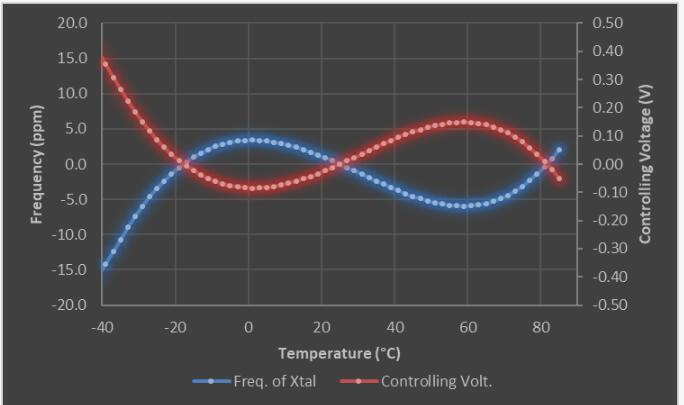 溫補(bǔ)晶振溫度(ΔT)將轉(zhuǎn)換為成比例的溫度電壓(V_T).下一步,使用多項(xiàng)式函數(shù)發(fā)生器將溫度電壓(V_T)轉(zhuǎn)換為特定的控制電壓(V_C.