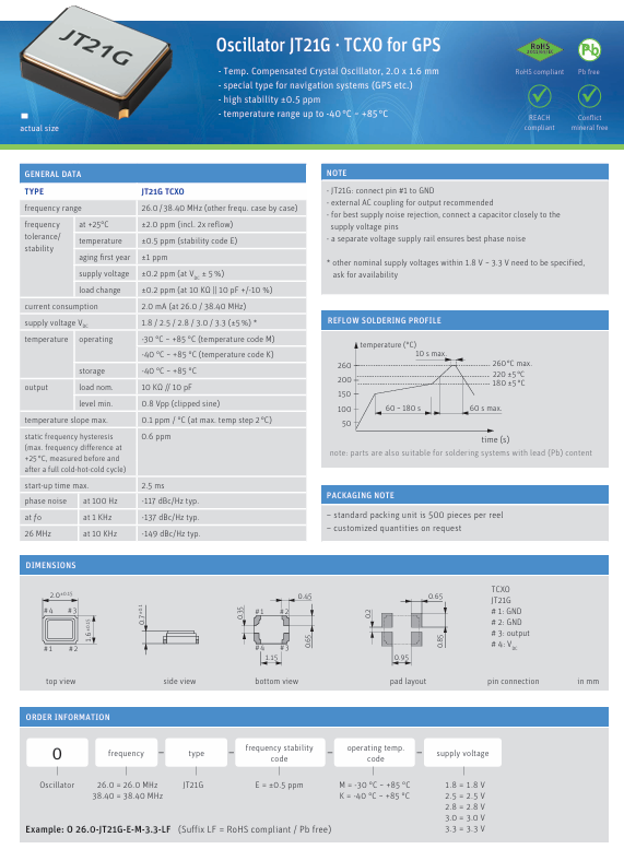 O 26,0-JT21G-E-K-3,3-LF Jauch Quartz OSC TCXO 26MHZ 3.3V SNWV TCXO 削峰正弦波 3.3V ±500ppb -40°C ~ 85°C 4 2016