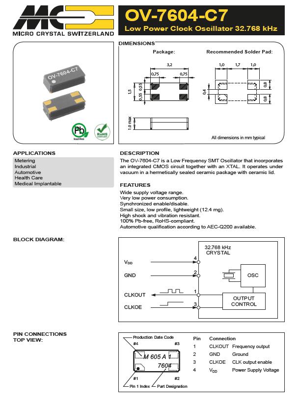 隨之不久微晶公司發(fā)布了編碼OV-7604-C7-32.768kHz-20PPM-TB-QC,型號(hào)OV-7604-C7是一款低功耗時(shí)鐘石英晶體振蕩器32.768kHz,也是一款低頻SMT振蕩器,集成了CMOS電路和XTAL。它在真空下工作在一個(gè)密封的陶瓷包與陶瓷蓋。