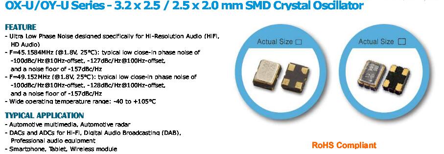在各種不斷增加的高音質(zhì)需求的數(shù)字音頻系統(tǒng),如智能電話,汽車音響,和可攜式音響系統(tǒng)中,需要為不斷增加的小型化和高性能的時鐘解決方案,也促使符合成本效益的系統(tǒng)設(shè)計(jì)也在增長.泰藝晶振的OX-U和OY-U系列是專門優(yōu)化,以解決Hi-Fi音響應(yīng)用的需求.
