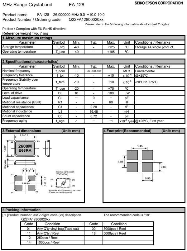 | Q22FA1280002000 | 2 x 1.6 x 0.5mm | FA-128 | 26.000000 MHz | 9 pF | +/-10 ppm |