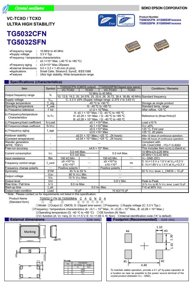 | X1G005401001800 | TG5032SFN | 30.720000 MHz | 5.00 x 3.20 x 1.45 mm | Clipped sine wave | 3.135 to 3.465 V | +/-1.0 ppm | -40 to ++85 °C |