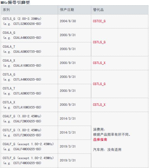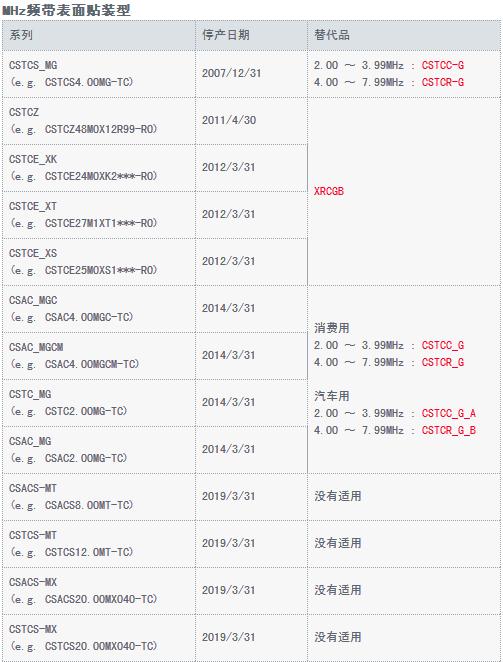 這次一共有三種類型的村田晶振被判出局,分別是MHZ頻帶表面貼裝型、MHZ頻帶引腳型、KHZ頻帶引腳型。接下來,壹兆電子會將Murata晶振停產(chǎn)的產(chǎn)品型號、日期和可代替產(chǎn)品料號完整的提供,請廣大新老客戶按照型號或系列對照,若有自己常用的型號請及時與我司壹兆電子業(yè)務(wù)人員聯(lián)系!